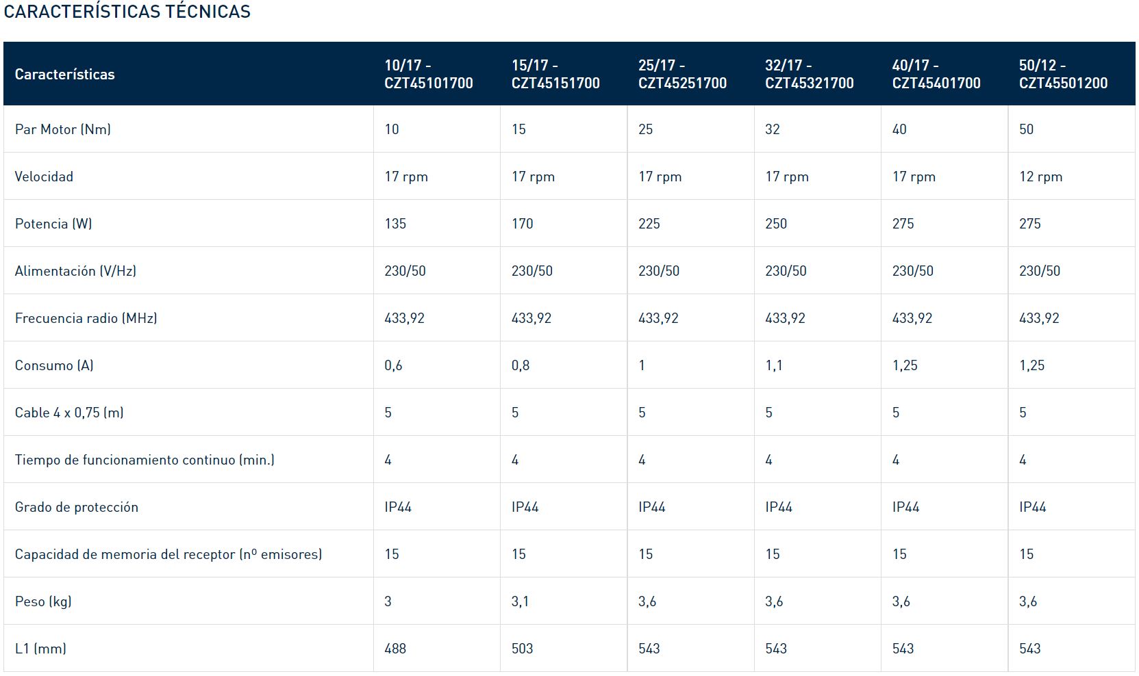 | Motores Nm | 10 Nm 17rpm, 20 Nm 17rpm, 30 Nm 17rpm, 40 Nm 17rpm, 50 Nm 12rpm |