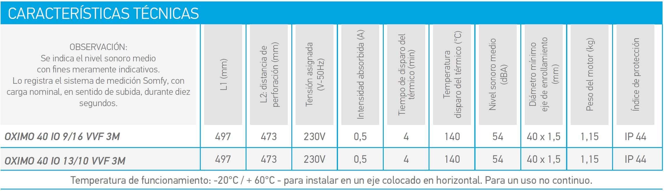 El motor vía radio Somfy OXIMO 40 io eje 40mm es un producto de alta tecnología diseñado para la automatización de persianas y toldos. Estas son sus especificaciones técnicas: