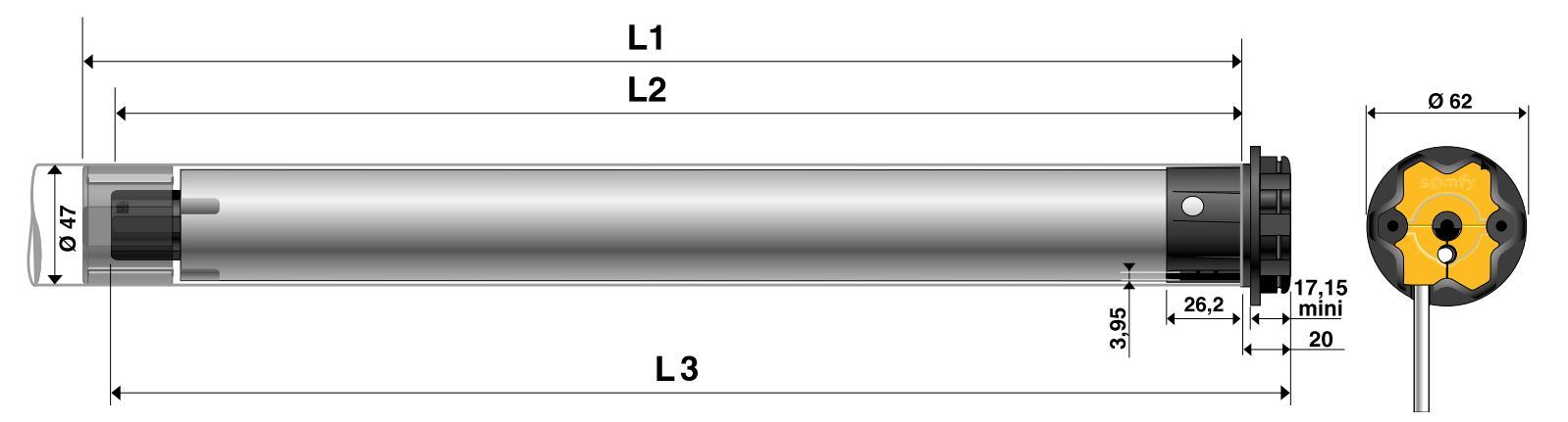 El Motor Somfy RS100 tiene un diseño compacto y elegante, con dimensiones que lo hacen ideal para una variedad de aplicaciones en el hogar y en entornos comerciales. Su peso ligero facilita la instalación sin necesidad de equipos especiales o modificaciones estructurales.