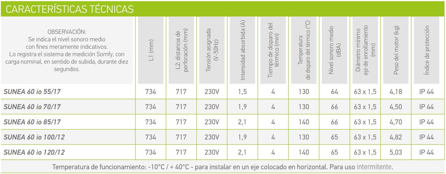 Características técnicas del motor vía radio Somfy SUNEA 60 io (toldo con cofre)